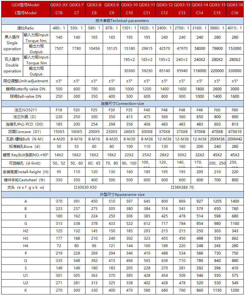該系列是小蝸輪箱與大蝸輪箱對接組合成為二級傳動蝸輪減速增壓機構,提高了機械總效率,輸入小力矩,開動大閥門,使操作人員省力,每種型號提供多個傳動比,特殊型可輸出360°無限多回轉,能更好的匹配不同規(guī)格的閥門。
